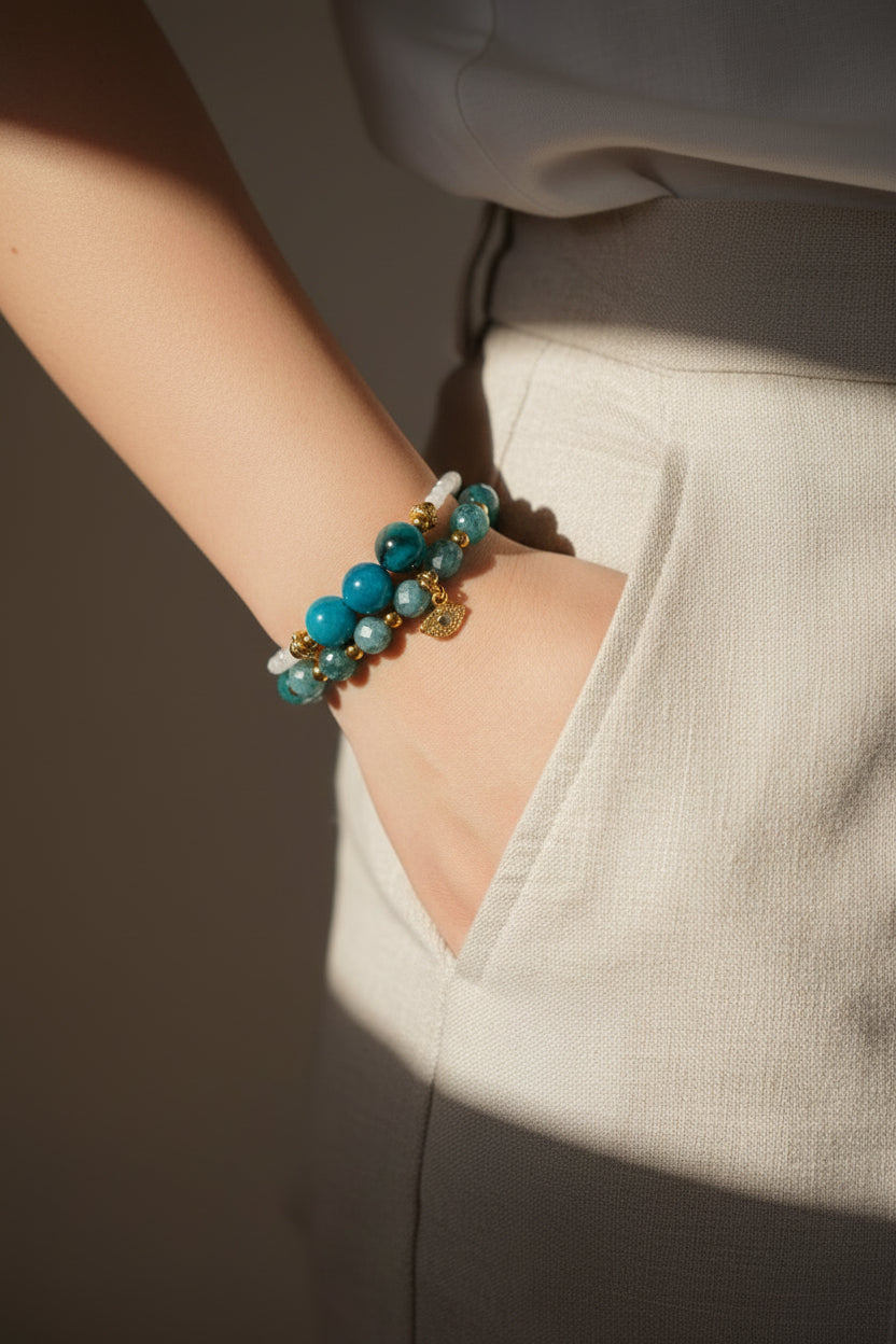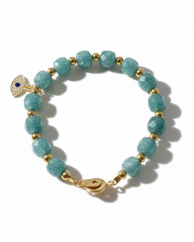 Celebrate 2026 with this elegant gemstone bracelet, featuring soothing blue-green chalcedony stones and a protective evil eye pendant. Simple, striking, and full of positive energy.