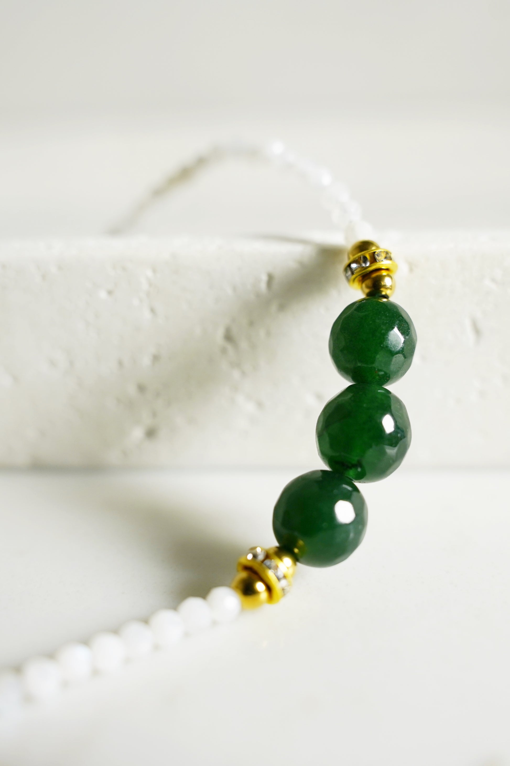 A simple yet elegant bracelet designed for everyday wear. Handcrafted with three natural high-grade Faceted Emerald Chalcedony stones paired with Faceted White Moonstone. Finished with a pearl pendant, customizable with your chosen initial, and detailed with high-quality stainless steel 18K gold-plated components for a lasting, luxurious shine.